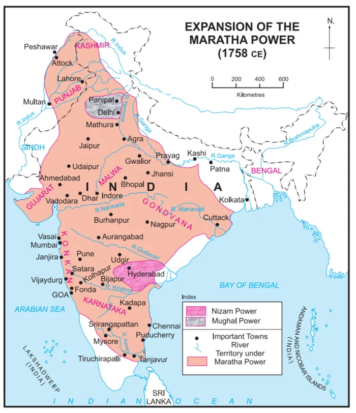 К середине XVIII столетия, пользуясь упадком Могольской империи, маратхи заняли огромные пространства и фактически разрушили всякую реальную власть исламских правителей на большей части Индостана.