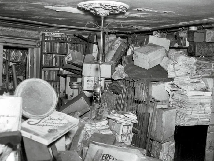 А 21 марта 1947 года в полицию позвонил неизвестный, сообщивший, что из дома Кольеров пахнет мертвечиной. Там так-то и раньше пахло отнюдь не петрикором, и к таким звонкам в полиции привыкли, но приехавший патрульный действительно унюхал покойника. Попытки пробраться в дом особого успеха не имели: на окнах решётки, двери закрыты, ни звонка, ни телефона нет. Патрульный вызвал подмогу, и, повторно выпилив дверь, команда из шести человек принялась разгребать мусорную стену, состоящую из газет, складных кроватей и стульев, запчастей от винного пресса и многого другого. Наконец патрульный устал и, изловчившись, забрался в окно второго этажа. Сильно легче от этого не стало, комната была до потолка завалена старым хламом. Через пять часов раскопок поисковая партия в небольшой нише, до потолка заполненной газетами, нашла Гомера Кольера. По словам судмедэксперта, Гомер был мёртв уже десять часов, а умер он от голода и болезни сердца.