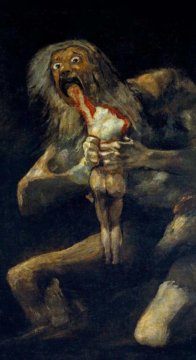 «Картина "Сатурн, пожирающий своего сына" Франсиско Гойи на самом деле никогда не получала такого названия от самого художника. Эту картину даже не хотели видеть, и она стала известна только после того, как он покинул место, где жил, за пять лет до своей смерти. Он никогда не объяснял и не говорил об этой картине; позже люди решили, что на ней изображен Сатурн, пожирающий своего сына, потому что на ней изображен большой человек, пожирающий тело поменьше. Специалисты считают, что эта картина может иметь гораздо более глубокий смысл, но мы этого никогда не узнаем».