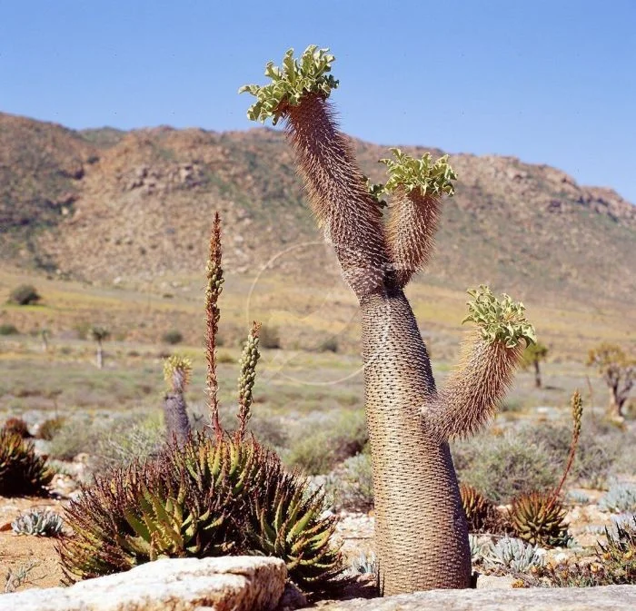 Pachypodium namaquanum, также известный как полмен или слоновий хобот, - ещё одно суккулентное растение родом из Южной Африки. Растение состоит из одного стебля высотой до трёх метров и диаметром до 30 сантиметров (напоминает слоновью ногу), увенчанного розеткой листьев на вершине. Весь ствол густо покрыт острыми шипами.