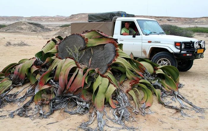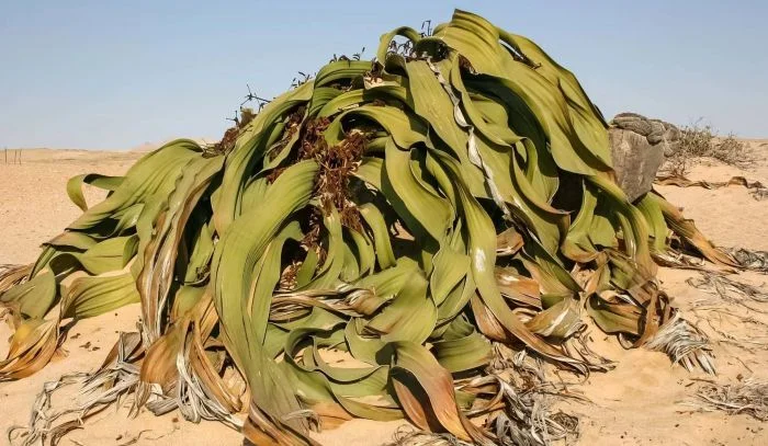 Welwitschia mirabilis растёт только в засушливых пустынях Намибии и Анголы. Растение необычно своими крупными, похожими на ремешки листьями, которые непрерывно растут вдоль земли. На протяжении всей жизни растение выпускает только два листа, которые часто разделяются на множество оборванных сегментов в результате того, что листья треплет ветер. Радиоуглеродное датирование самых крупных растений показало, что возраст некоторых представителей превышает 1500 лет.
