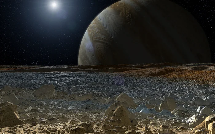 Такой прекрасный вид может открываться со спутника Юпитера – Европы. Воды здесь, кстати, больше чем на Земле. Просто она идет вглубь Европы. И, весьма вероятно, под слоем льда есть океан жидкой воды
