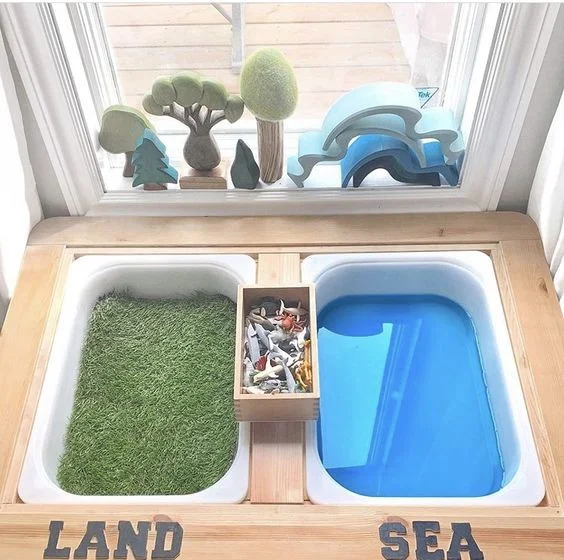 Покупаете набор зверей и 2 тазика: в один воду, в другой землю или траву, если ребёнок уже не ест всё подряд