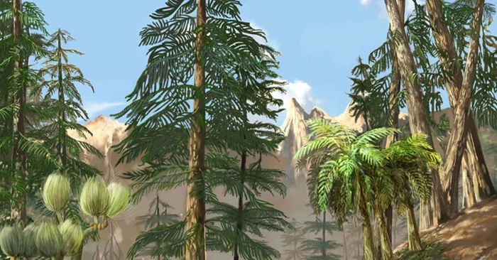 Леса состояли в основном из примитивных растений, таких как папоротники и древние хвойные.