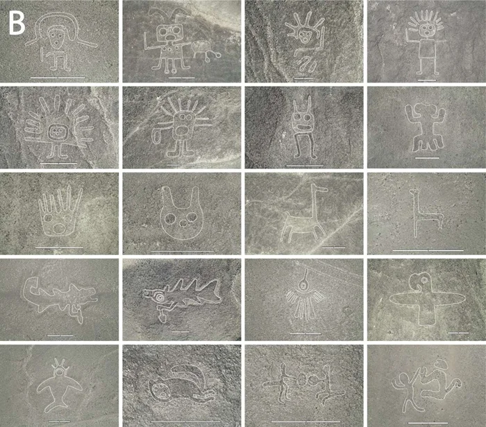 Среди найденных геоглифов есть изображения птиц (колибри, пеликаны, кондоры), животных (ламы, змеи, ящерицы), людей, а также различные геометрические фигуры. Но не все геоглифы так легко интерпретировать.