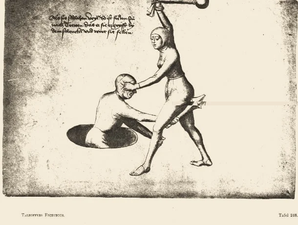 Её противник – мужчина с дубиной, стоит по пояс в яме (чтобы «сровнять» шансы на победу). Мужчина ограничен в движении, а у женщины есть преимущество в дальности атаки. Но это не значит, что победа ей обеспечена. Тальхоффер, как мы увидим дальше, делает ставку на оборону и использование слабых сторон и ошибок противника.