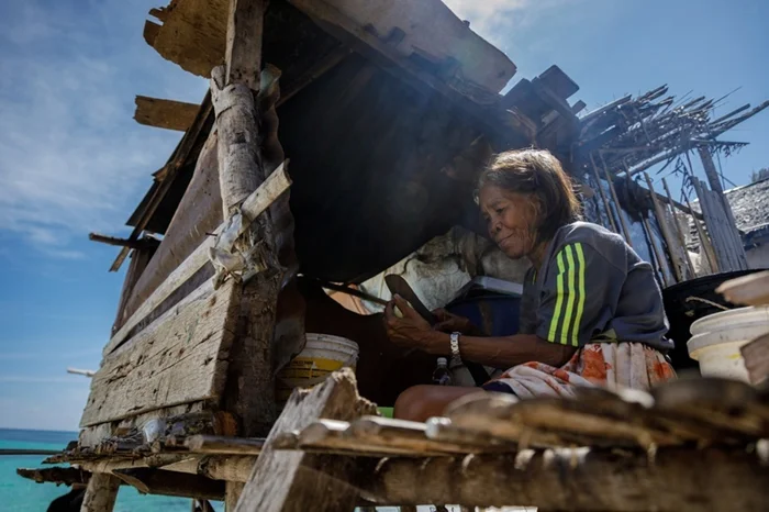 Фото с воздуха одного из последних поселений морских цыган Баджао, живущих в домах на деревянных сваях.
