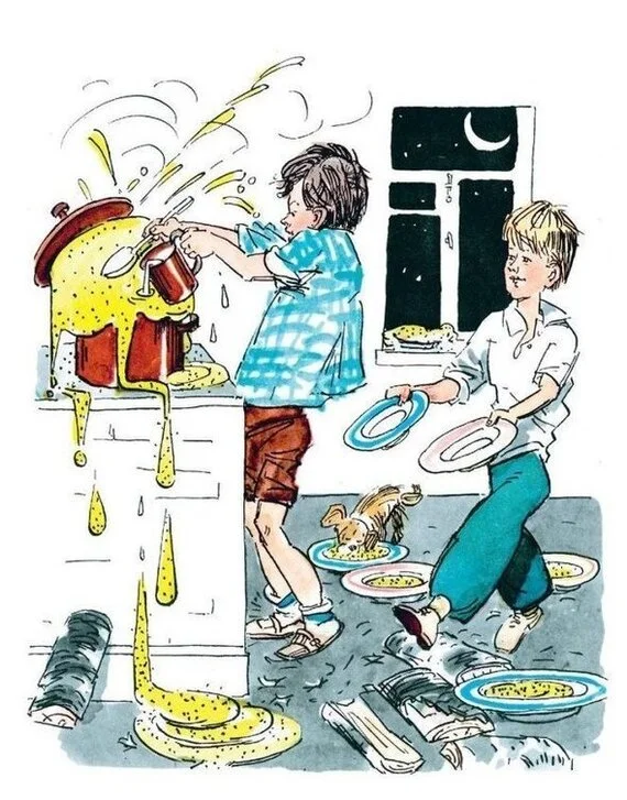 Чем заняты в рассказе «Мишкина каша» Коля и Мишка? Тем же, чем и все остальные дети в то время: хотят есть. Ведь рассказ был издан (в сборнике «Тук! Тук! Тук!») в 1945 году. Правда, у Коли с Мишкой в отличие от большинства тогдашних детей всё-таки есть продукты: «Сыпь крупы побольше!..», «Нарезали мы хлеба, намазали его вареньем…», «Масло попробовали без хлеба есть — тошно…». Этакая «лакировка действительности», а на самом деле — попросту обобщение. Оно позволяет читать рассказ о том, как варить кашу и выпутываться своими силами из затруднительных ситуаций, и через пятьдесят лет.