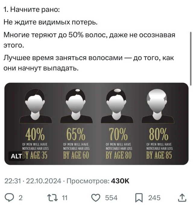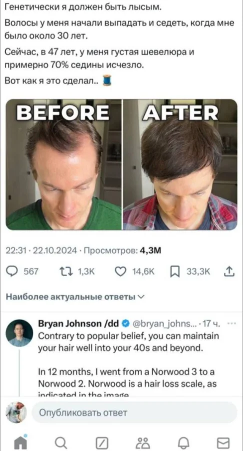 Многие мужчины лысеют. Кто-то раньше, кто-то позже. И особенно обидно, когда волосы начинают прощаться с головой в 30 лет. Тут остается либо смириться, либо записываться на пересадку волос. Не в парике же ходить, верно? Но один парень по имени Брайн Джонсон расписал подробный гайд по восстановлению лысеющей шевелюры! Он смог восстановить 70% своих волос, несмотря на генетическую предрасположенность к облысению. Что ж, давайте поглядим, как у него это получилось.