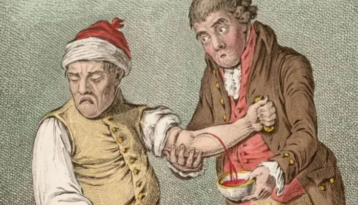 Эскулапы того времени творчески переработали наследие древних и вывели основной принцип врачевания: учение о четырёх гуморах. Это кровь, флегма, жёлтая и чёрная жёлчь - они считались главными жидкостями в организме. И если одной из них становилось больше, человек заболевал.Чтобы победить эти гуморы и сбалансировать их, врачеватели чаще всего использовали кровопускание. Им лечили всё: от головных болей до геморроя. Для этого использовали ланцет или пиявок. Кстати, пиявки широко применяются в медицине до сих пор.