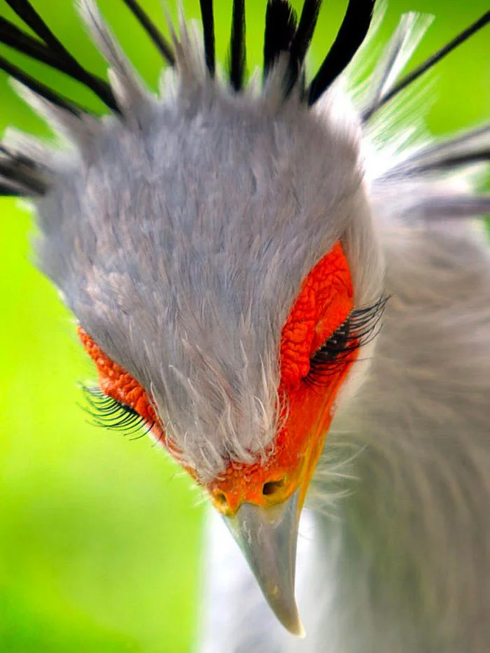 Такой красоте позавидует любая женщина. А столь естественной выразительности не сможет добиться ни один мастер. Но птице-секретарю, обладающей столь выразительными ресницами, хвастаться некогда. Эта хищная птица уникальна тем, что охотится в основном на земле, пугая мелкую живность и убивая её ударами сильных лап.