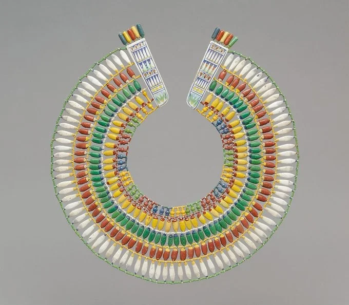 Аксессуар был изготовлен в Египте около 1353-1336 гг. до н.э. Он сделан из бусин из фаянса и украшен яркими рядами из лепестков лотоса, фиников и васильков. Такой воротник не только подчёркивал красоту, но и часто использовался для обрядов и ритуалов, символизируя плодородие и защиту.
