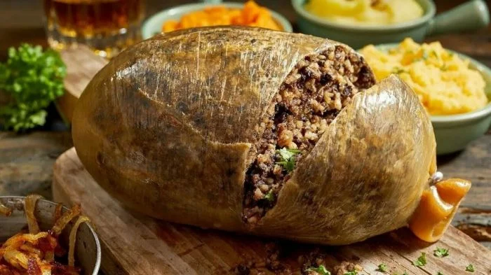 Это блюдо, подаваемое в Шотландии, состоит из овечьего желудка, фаршированного бараньей печенью, лёгкими и сердцем, луком, овсянкой и различными специями.