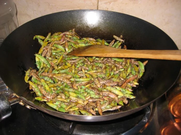 Этот кузнечик, которого подают в Уганде, является деликатесом в жареном, сушеном или варёном виде. Отлично сочетается с луком.