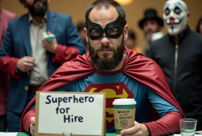 Надпись можно перевести как: "Супергерой ищет работу" (дословно - Супергерой доступен для найма)