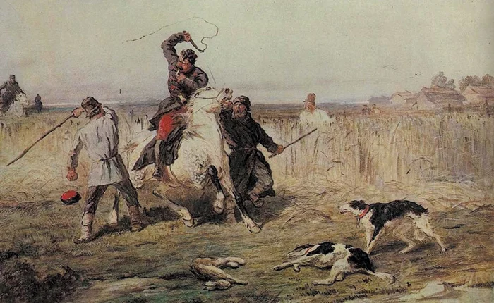 П. П. Соколов "Потрава помещиком хлеба на крестьянском поле. Крестьяне расправляются с помещиком" (60-е гг. XIX века). На этой акварели антигерой-помещик травит зайца на крестьянском поле, одевшись в типичную венгерку