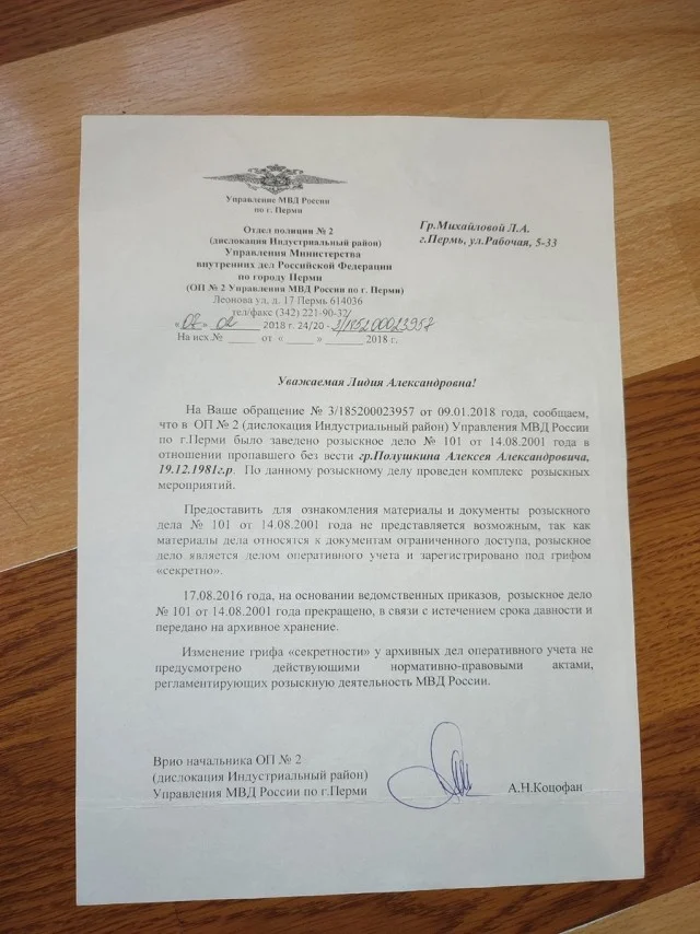 В официальном ответе УМВД по городу Перми говорится, что «по данному розыскному делу проведен комплекс розыскных мероприятий», но каких, маме так и не сказали, потому что материалы дела относятся к документам ограниченного доступа, а само дело зарегистрировано под грифом «секретно».