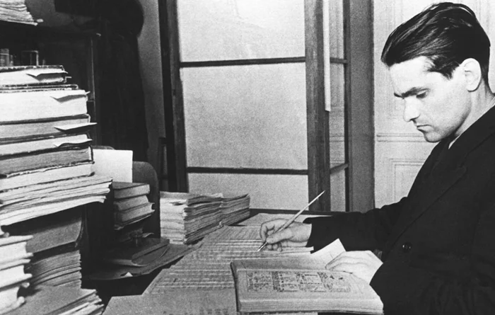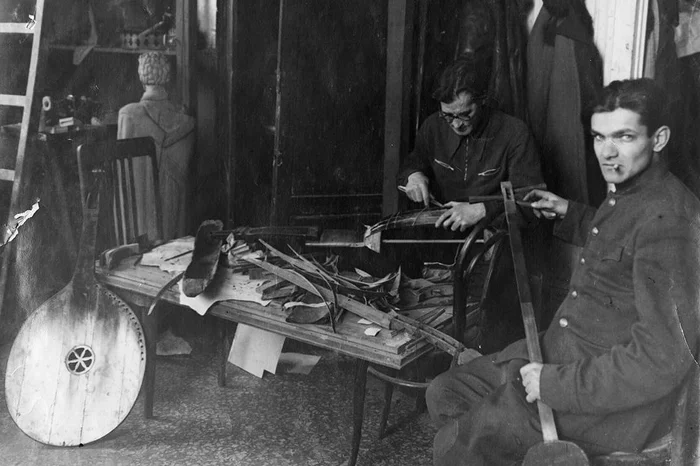 Юрий Кнорозов вместе с реставратором Анатолием Дмитриевым разбирают коллекции, находившиеся в укрытии в период Великой Отечественной войны. Ленинград. [1948]
