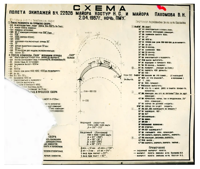 Первый ведомый экипаж следует в точку начала разворота на 1 км правее намеченной траектории со скоростью 455 км/ч и набирает 1260 метров. По команде "сбор" экипажи должны продолжить маневр с разворотом еще на 90º и занятием своих высот. Отсчет идет по секундомеру штурмана. Командир первого ведомого подает команду «Пуск» с опозданием на 4 секунды. Стараясь исправить допущенную неточность в расчете выхода к точке сбора, командир увеличивает крен до 20º, продолжая выполнять набор высоты.