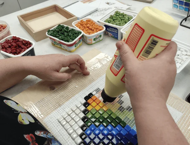 Мы клеим им мозаику к фанере, дереву и строительной сетке. Как правило, через 5 минут оторвать стеклянную плитку от дерева без использования ядерной бомбы уже не представляется возможным.