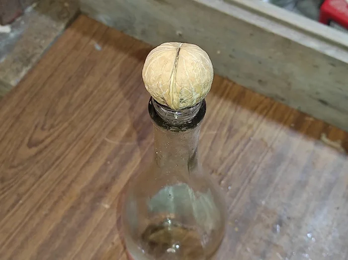 Кладём орех сверху на бутылку так, как показано на фото ниже, то ест вертикально.
