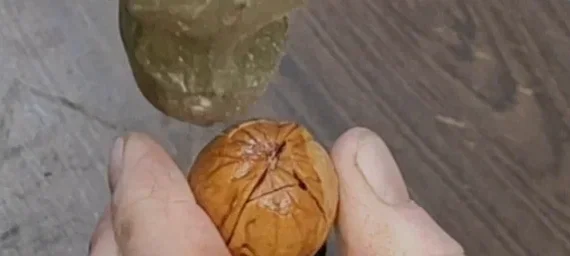 Придерживая одной рукой орех, другой колотим аккуратно сверху молотком, разбивая верхнюю часть скорлупы.