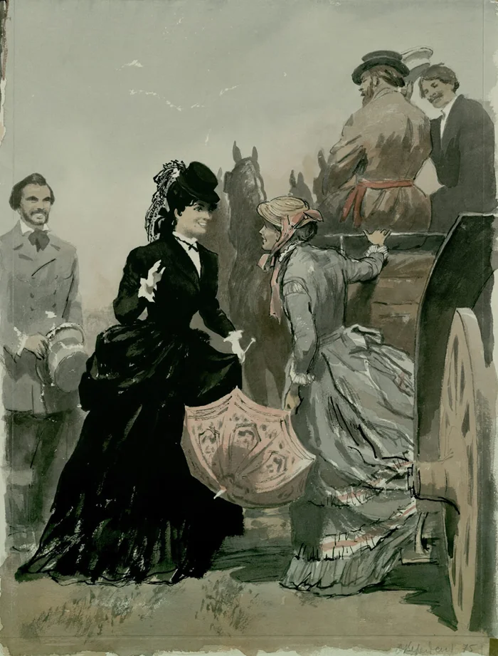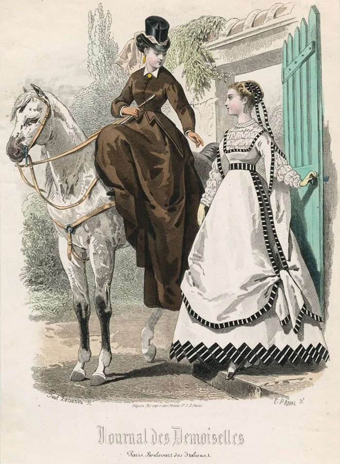 Амазонка - женское платье из бархата, сукна или плотного шёлка с юбкой особой асимметричной конструкции, предназначенное для верховой езды в дамском седле. Юбка амазонки была заметно длиннее с одной стороны, чтобы полностью закрывать ноги женщины, сидящей боком в седле. У юбок также часто был длинный шлейф. При ходьбе этот шлейф дамы придерживали рукой. Первоначально у амазонок были пышные юбки, но в 1870-х появились и более узкие варианты. Ездить в обычном седле дамам считалось неприличным, к тому же в платьях в любом случае это было неудобно. Некоторые особо дерзкие любительницы верховой езды предпочитали ездить по-мужски и даже надевали при этом мужскую одежду. Амазонка и дамское седло были вариантом приличным и по-своему кокетливым, так как залезть на лошадь, слезть с нее, ходить, не спотыкаясь и изящно поддерживая юбку, требовало сноровки, но с другой стороны подчеркивало грациозность дамы.