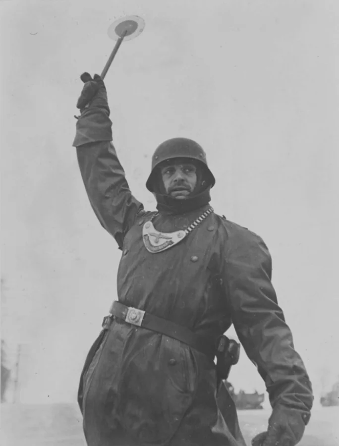 Унтер-офицер немецкой полевой жандармерии на дороге в окрестностях Москвы. Декабрь 1941