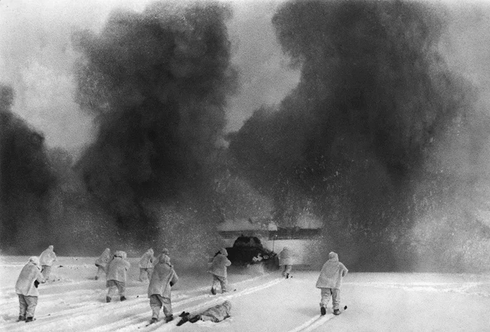 Бойцы РККА во время боя за деревню в Подмосковье. Декабрь 1941