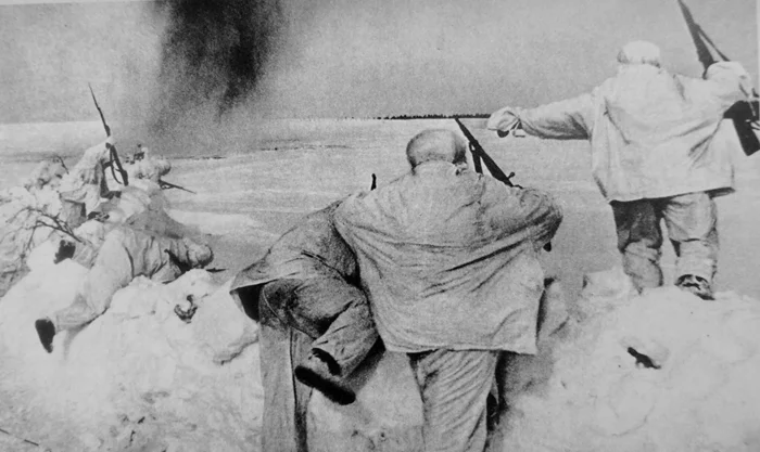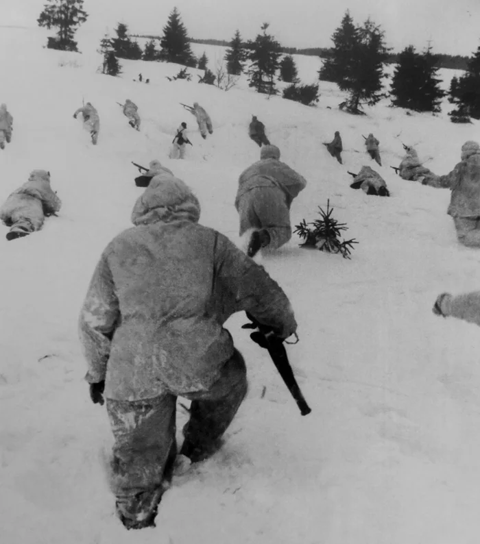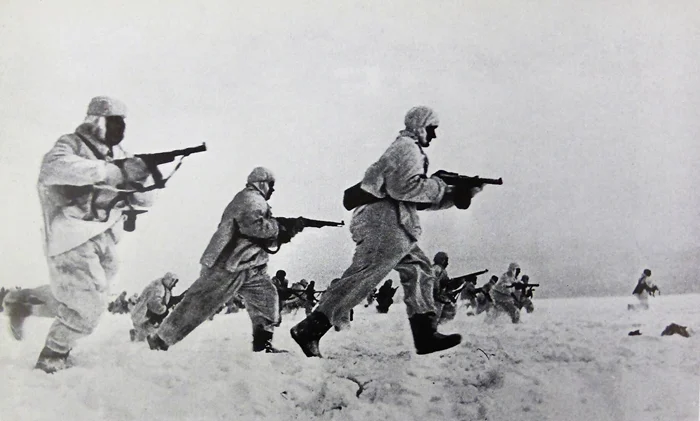 Советская пехота переходит в контратаку с оборонительного рубежа под Москвой. Декабрь 1941