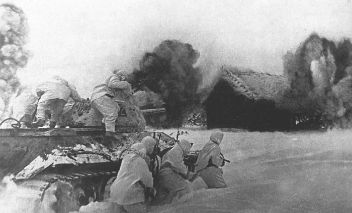 Советский танковый десант при поддержке танка Т-34 атакует занятую противником деревню. Декабрь 1941