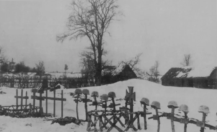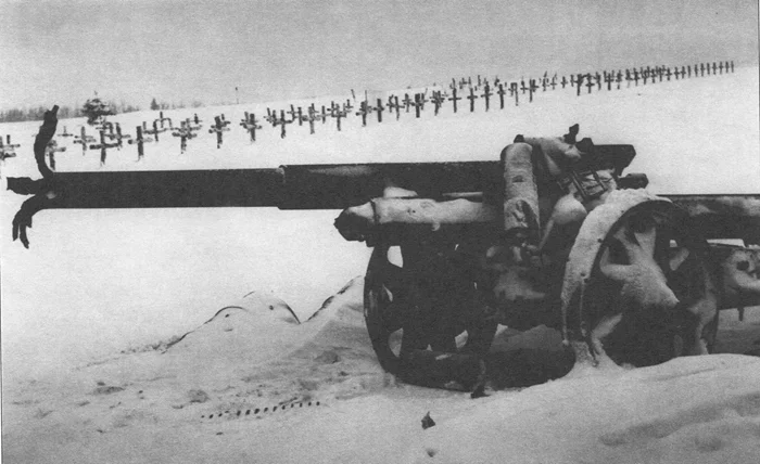 Разбитая немецкая 150-мм гаубица и могилы солдат вермахта, погибших в битве за Москву