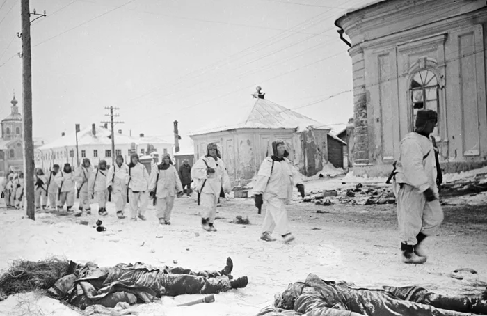Бойцы Красной Армии вступают в освобождённый город Торопец мимо тел убитых немецких солдат, лежащих на обочине. Фото - Самарий Гурарий