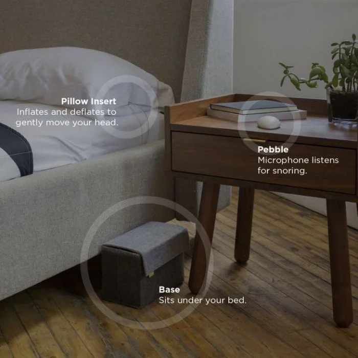 Устройство работает следующим образом: возьмите свою любимую подушку, поместите под неё вкладыш, положите «камешек» где-нибудь рядом с кроватью и ложитесь спать. Когда вы начнёте храпеть, гаджет будет мягко двигать вашей головой, не разбудив вас, и вы перестанете издавать этот неприятный звук.