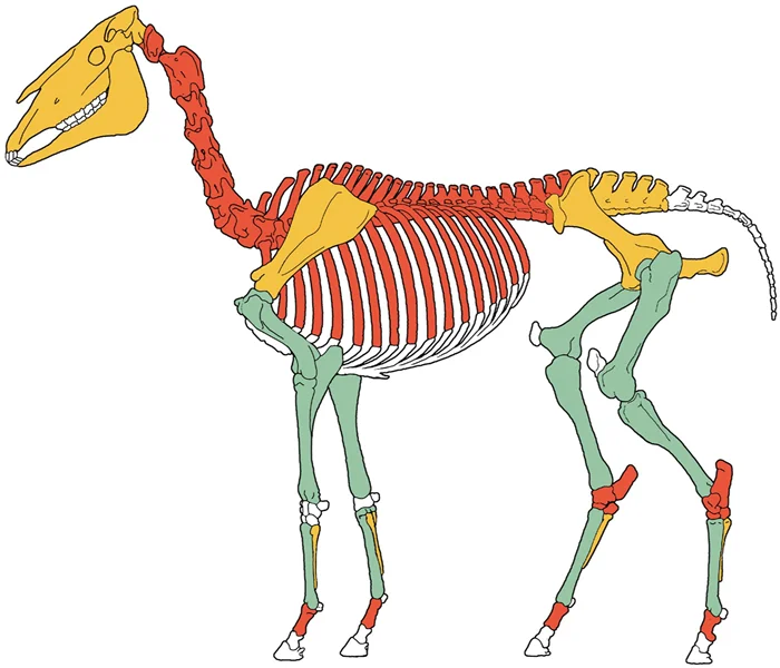 Частота порезов на разных частях скелета лошади показана разным цветом: зелёный - высокая частота, оранжевый - средняя, красный - низкая; белые кости без порезов