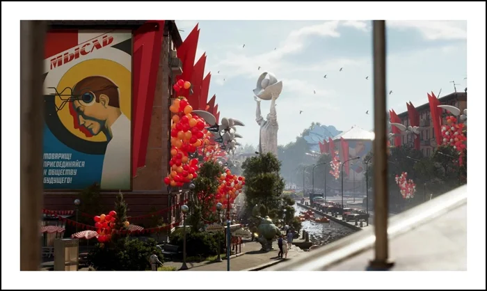 Сталинский ампир с массивными шпилями, большими арками и зданиями из гранита удивительно сочетается с летающими дронами, помогающими людям роботами и прочими достижениями советской научной мысли. Именно величие учёных, торжество интеллекта и изобретение загадочного полимера позволило СССР стать внушающим трепет, великим государством, что мы видим в самом начале игры.