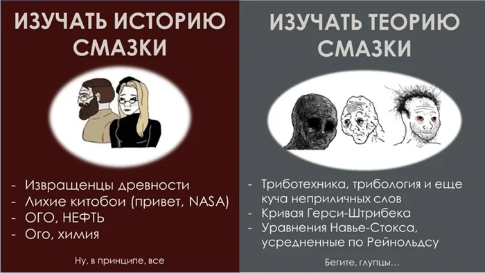 Ведь на самом деле, мысль о том, что для облегчения движения надо что-то смазать у нас глубоко интуитивна. Она входит в наш умозрительный набор опыта, который состоит из самых базовых установок, по типу «если что-то кинуть вверх, оно упадет вниз», «если колечко не снимается с пальца (при разводе), намыль его мылом» и так далее. Поэтому и история технических смазок – очень-очень древняя, а вот изучение принципов смазывания и основы науки о них появились не так давно.