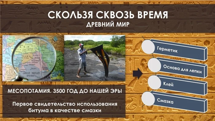Итак, наша первая крайняя точка. Месопотамия, 3500 год до нашей эры. Где-то там возле города Хит нашли то, что местные называли Фонтаном Смолы, а мы называем природным битумом. Битум – в нашем случае, это, грубо говоря просочившаяся наружу и выветренная нефть.