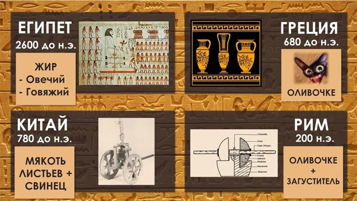 Соответственно мы можем даже раскидать известные нам древние смазки по этой классификации: битум – минеральная смазка, оливковое масло - растительная, сало и жир – животная, а до синтетических еще ждать и ждать.