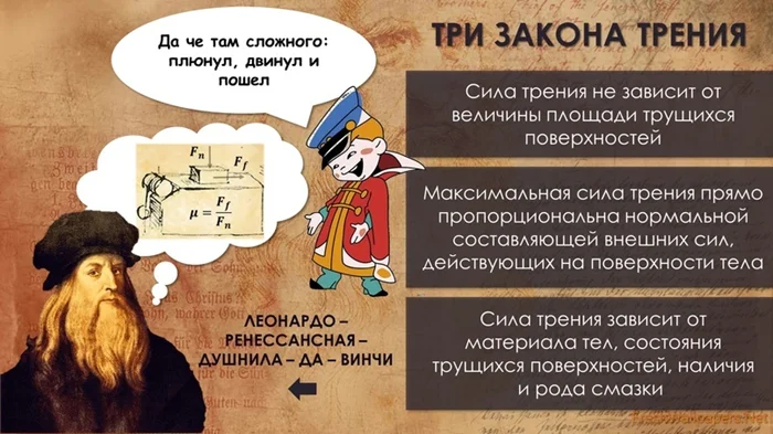 Да Винчи дошел до мысли о том, что сила трения между двумя скользящими телами соразмерна с нагрузкой, сдавливающей эти тела. И что удивительно, не зависит от площади контакта между ними (технари молчать! мы рассматриваем простейшие случаи). Впоследствии его работы были доведены до ума Гийомом Амонтоном, который выразил их в трех основных законах трения (Там еще Кулон, правда, присосался, но не суть).