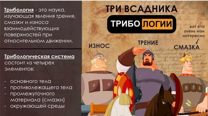 Трибология – это междисциплинарная наука. Ее основным полем исследований является взаимодействие между поверхностями в относительном движении и последствия этого взаимодействия. Таким образом, она изучает и физические свойства поверхностей, и химические свойства смазки, и наоборот, короче, наука на стыке. Очень модная вещь в последние десятилетия. Соответственно триболог – это человек, занимающийся данной наукой, а основными объектами исследования являются трение, износ и смазка. Тут очень все логично, ибо из-за трения возникает износ, который можно уменьшить, применяя смазку.