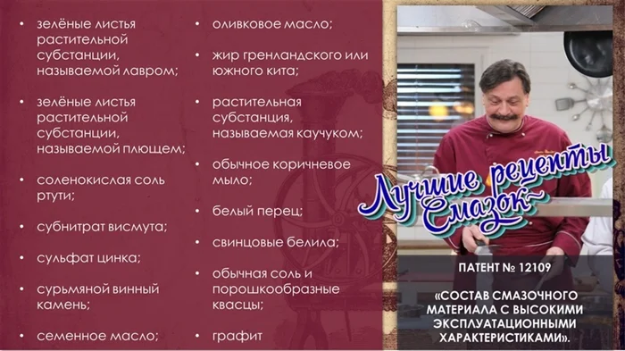 Некоторые добавки или присадки, как их можно было бы назвать сегодня – были вполне оправданы. Например, квасцы или соли кальция загущали масло и повышали его «прилипание» к металлам, адгезию, они до сих пор используются. Однако некоторые рецепты напоминали скорее составы снадобья средневекового алхимика. Например, на картинке выше перечислены ингредиенты запатентованной смазки британца Джозефа Долана. Тут и лавр, тут и плющ, соль ртути, жир кита, белый перец (зачем перец, черт его знает). И так далее.