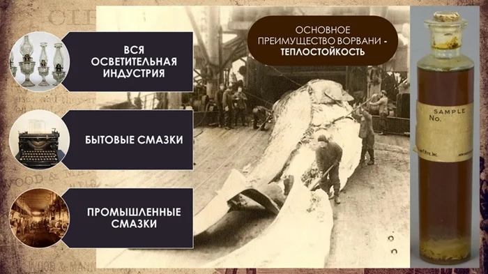 Ворвань, как уже было сказано, была известна с древности, но с появлением масляных ламп – жир китов стал просто незаменим в повседневной жизни. Кроме того, ворвань попала в фары шахтеров, осветительные системы маяков, стала стандартной смазкой для оружия, часов, швейных и пишущих машин. Что разумеется было катастрофой для китов и их жирочка. Его главным преимуществом была термостойкость, критичный для других смазок параметр.