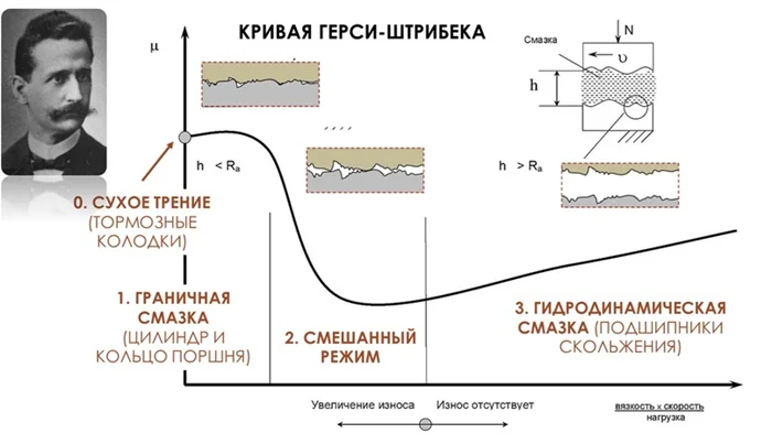 Так вот, при разных скоростях работы, нагрузке на деталях и разных смазках, коэффициент трения выстаивался в красивую кривую на графике, где четко выделялись отдельные области. Это наблюдение привело к разработке одной самой понятной и известной диаграммы в области трибологии — кривой Герси-Штрибека. У нас принято говорить просто кривая Штрибека.