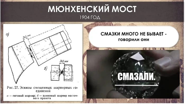 Что произошло? Одно слово. Немцы. Вся штука в том, что инженеры считали коррозию самой страшной проблемой для стальных шарниров и так ее боялись, что вычистили и отшлифовали шарниры настолько, что слишком уж понизили коэффициент трения. А потом кто-то очень ответственный и умный предложил дополнительно смазать их стерином. Этот побочный продукт животного жира, тоже использовался как вариант смазки. Короче, мост тупо соскользнул с опор из-за этой смазанной системы шарниров. Это как бы противоположный пример: мол, слишком хорошо тоже не есть хорошо, и это правило, кстати, работает в том числе и в подшипниках, и в других механизмах. Ведь многие системы оснащены защитой от потери смазки и поэтому лишнее вещество не выходит наружу, а наоборот излишне нагружает ее. Ну ладно, поехали дальше.