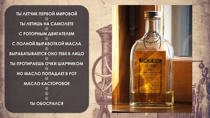 Кстати, про касторовое масло в качестве смазки есть и еще одна веселая история времен Первой мировой. К тому времени в новоиспеченной военной авиации использовались ротативные двигатели с полной выработкой масла, которое во время работы распылялось более 2 литров за час. В них как раз использовали дешевую касторку, так как минеральное масло было не так широко доступно. А еще касторка в отличие от еще не особо вариативной минералки, не смешивалась с бензином, поэтому при сгорании топлива свойства сохранялись.