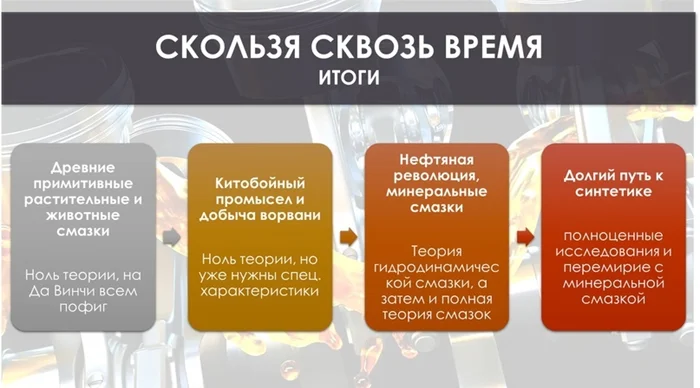 Исторические итоги: мы в сжатой сдвгшной форме пролетели от использования растительных и животных масел до нефти и искусственного масла. Отметили несколько важных точек, например, переход на жир китов, потом на минералку, а потом и открытие синтетики.