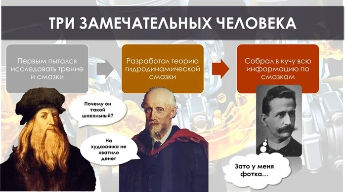 Итоги в людях: Познакомились с тремя главными героями науки о смазках – Да Винчи, Рейнольдсом и Штрибеком. А так же некоторыми энтузиастами скользкого бизнеса.