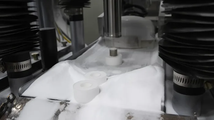 Технологический цикл предусматривает размещение нагревательной трубки в блоке талька, изготовленном на том же предприятии по аналогичной методике. Металлические контакты располагаются на противоположных концах блока. Тальк однородно уплотняется вокруг алмаза, когда на заготовку давит шестипоршневой кубический алмазный пресс.