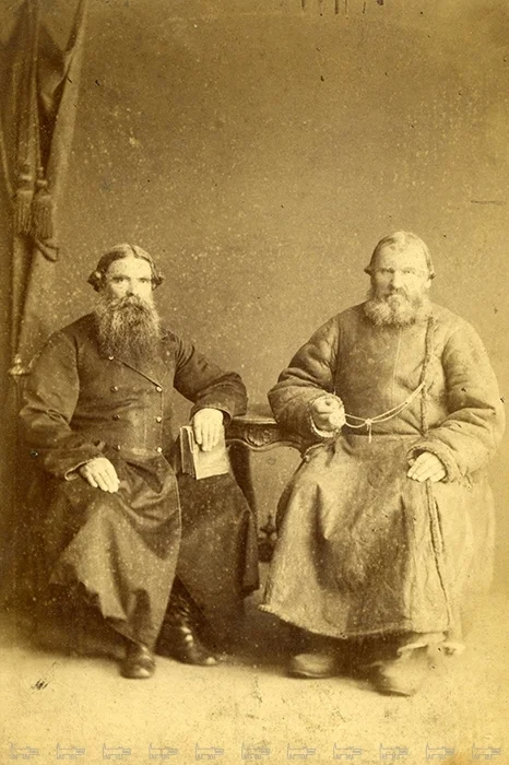 Купцы. Ателье «Фотография М. Рыбакова», Москва. Конец 1860-х – начало 1870-х гг. Архив О. А. Хорошиловой. справа мужчина в тулупе